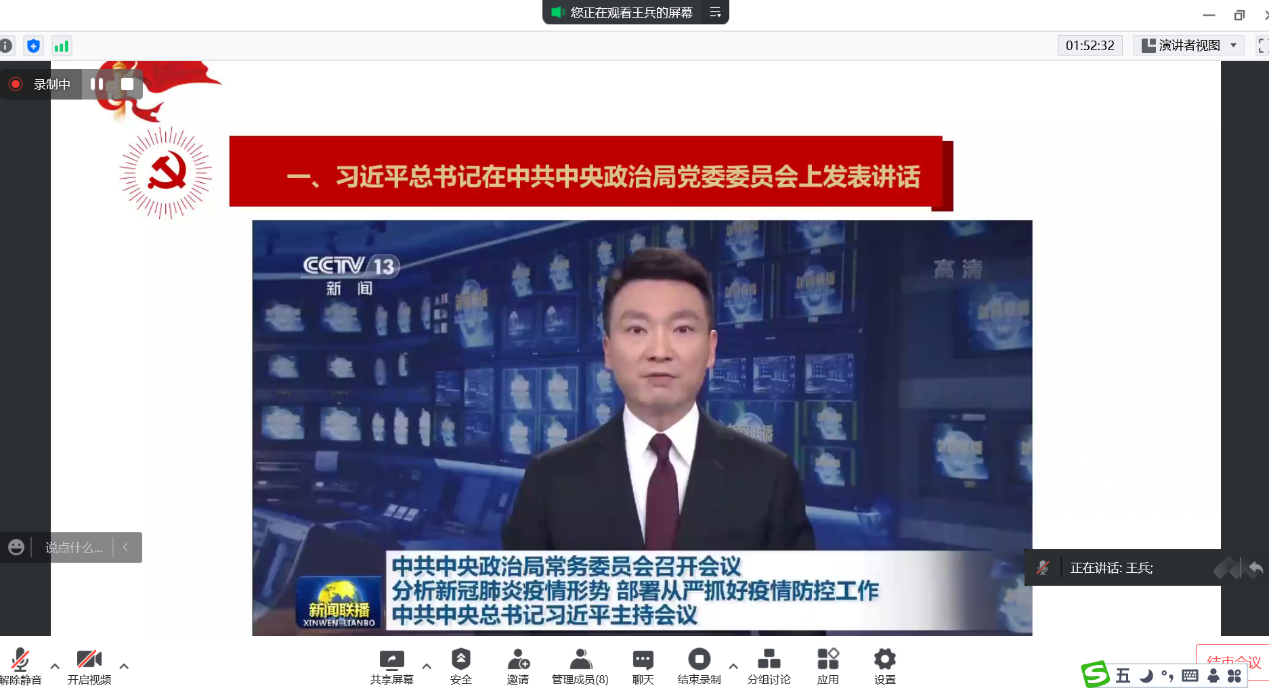 王兵介绍了全国近期的疫情数据,从4个方面领学习近平总书记在中共中央政治局常务委员会上关于疫情防控的重要讲话精神。一是从严从紧——“始终绷紧疫情防控这根弦”;二是精准防控——“努力用最小的代价实现最大的防控效果”;三是统筹兼顾——“最大限度减少疫情对经济社会发展的影响”;四是共克时艰——“只要我们同舟共济、守望相助,就一定能够彻底战胜疫情,迎来人类发展更加美好的明天”。
