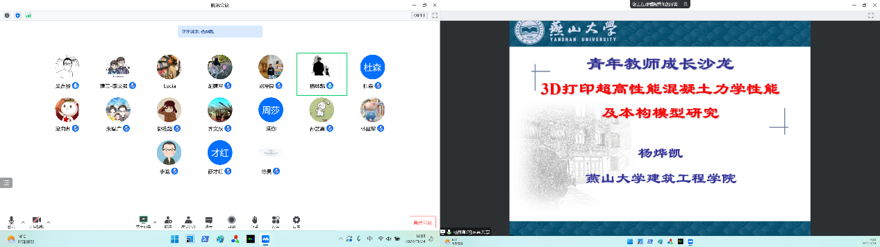 本次成长沙龙邀请土木工程系杨烨凯老师和郭维超老师做科研课题分享。杨烨凯老师对3D打印超高性能混凝土力学性能及本构模型相关研究成果进行了分享。杨老师描述了3D打印UHPC材料静态和动态力学性能的强度变化规律,揭示了3DP-UHPFRC的静态力学各向异性机理,并介绍了根据空间变换张量理论建立适用于3DP-UHPC的各向异性压缩本构模型的方法。郭维超老师分享了多源碱性固废协同激发胶凝材料的力学性能与水化机理。面对建材工业低碳绿色发展与大宗工业固废资源化利用的重大需求,郭老师介绍了碱渣、电石渣等碱性固废建材应用的技术瓶颈,提出了以废治废、类中药配伍相须相使的思想,开发了系列全固废胶凝材料体系并揭示了水化机理,在无筋制品领域实现了全替代水泥使用并逐步推进产业化应用。