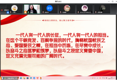 王楠老师首先从习近平总书记对青年的寄语讲起,分享了我校刘丹阳同学的从军故事,号召全体青年要牢记历史赋予使命,彰显时代担当,要拒绝平庸,铭记历史,要为中国式现代化伟大实践贡献力量;其次,讲解了抗击疫情、疫苗研制、抢险救灾、脱贫攻坚等危难时刻,广大青年党员冲得出来、顶得上去,展现青年党员的担当和奉献;随后讲述了青年一代创新创业,勇立潮头的先进事迹;最后,结合百年奋斗目标,号召我们新时代青年不断学习,提高自身素质,做好接力,承担建设重任。