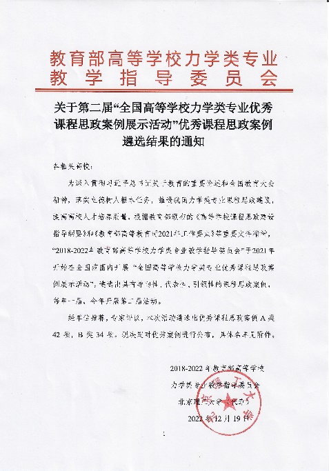 为深入贯彻习近平总书记关于教育的重要论述和全国教育大会精神,落实立德树人根本任务,推进我国力学类专业课程思政建设,提高人才培养质量,教育部高等学校力学类专业教学指导委员会从2021年开始每年面向全国遴选具有导向性、代表性、引领性的课程思政案例。经单位推荐,专家评议,本次遴选出优秀课程思政案例A类42项,B类34项。