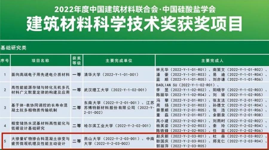 2023年3月30日,2022年度中国建筑材料联合会·中国硅酸盐学会建筑材料科学技术奖获奖项目公告发布,该奖是面向全国建材行业的综合性、权威性科技奖励。我院赵庆新教授作为“大掺量矿物掺合料混凝土徐变与疲劳微观机理及性能主动设计”项目成果第一完成人荣获基础研究类二等奖。
