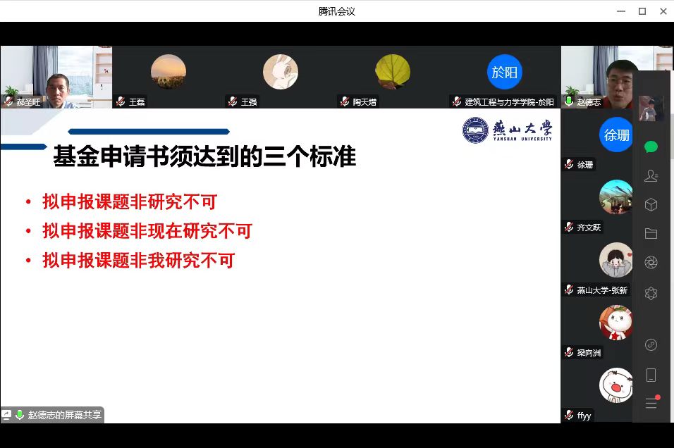 基于疫情发展现状,会议采取线上形式举行,由我院博士生导师郝圣旺副院长主持,邀请我院2022年度国家自然科学基金青年基金获得者赵德志博士,给大家做国家基金申请书撰写及申报经验分享交流,日本a片