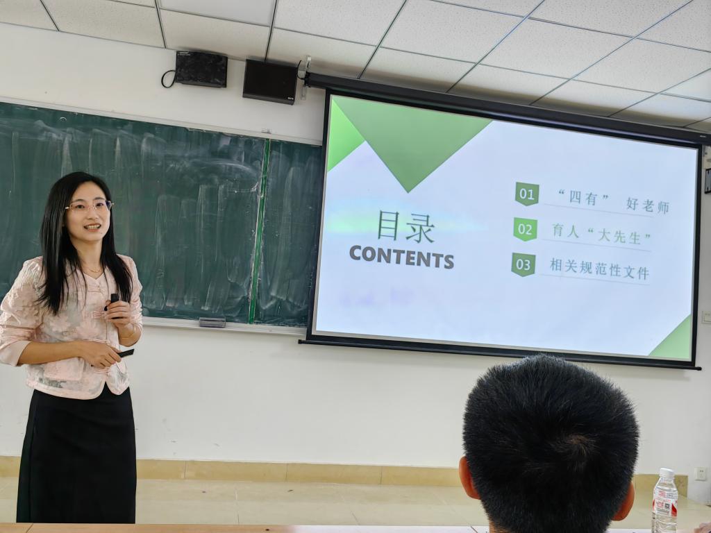 接着李婕副教授从树立“四有”好老师标准、争做育人“大先生”、相关规范性文件三个方面,具体阐释了师德师风的影响,提醒老师们要以案为鉴,树立底线思维,以德施教,以德育德,真正学为人师,行为世范。
