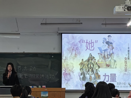 “她力量·闪耀光芒”PPT宣讲活动同样吸引了众多同学的积极参与。同学们通过精心制作的PPT,从不同角度展现了女性在各个领域的卓越成就和独特魅力。从科技前沿的创新突破到商业领域的纵横捭阖,从教育一线的辛勤耕耘到艺术天地的灵感绽放,提供了一个展示自我、提升能力的平台。
